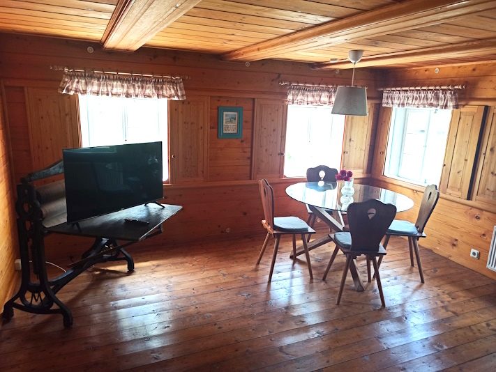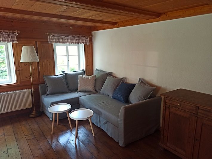 - Wohnbereich in der gemütlichen Blockstube mit ausziehbarer Schlafcouch